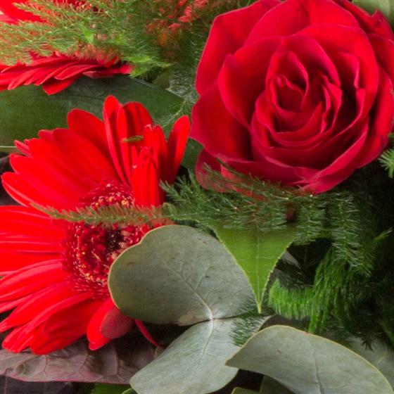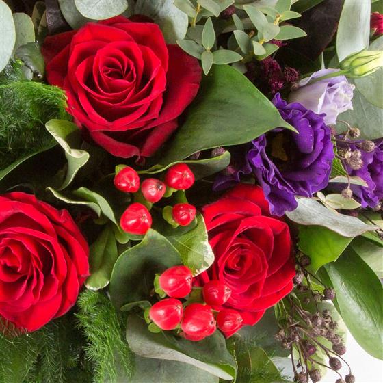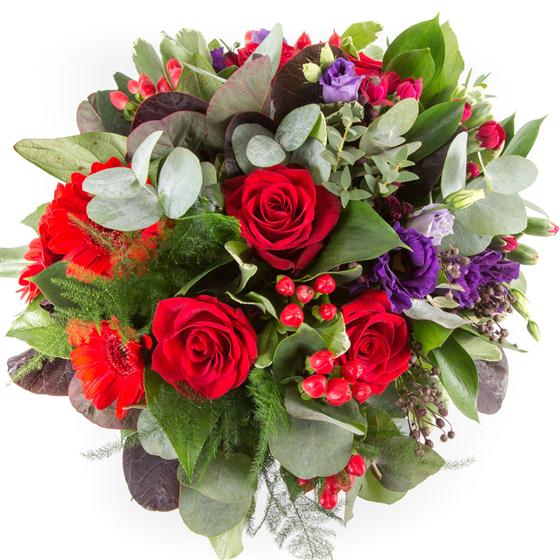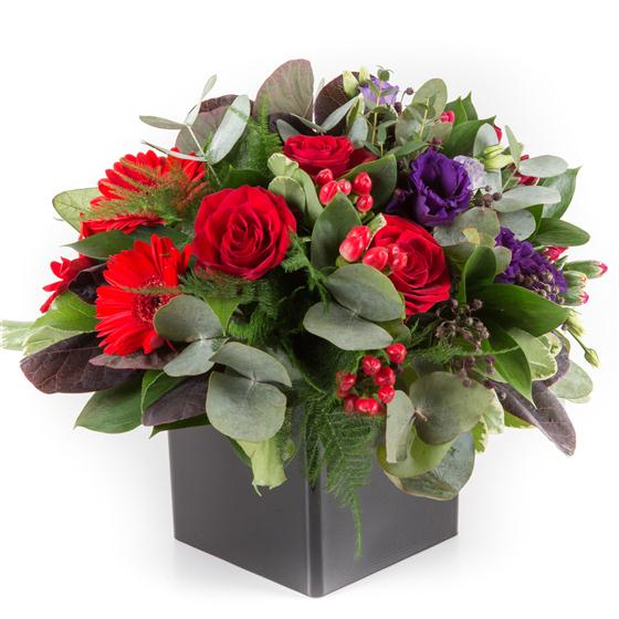 An opulent arrangement of scarlet red gerberas, deep red roses and rich purples combined with berries and unusual foliage.