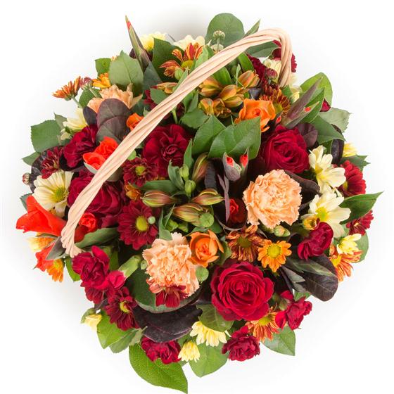 A rich mix of deep reds, rusts and golds. Including roses, spray carnations, alstromeria and chrysanthemums.